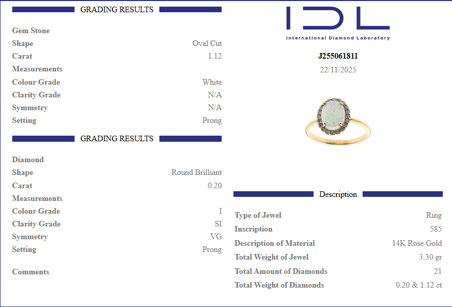 Това бижу притежава валиден международен сертификат, издаден от Iternational Diamond Laboratory (IDL).