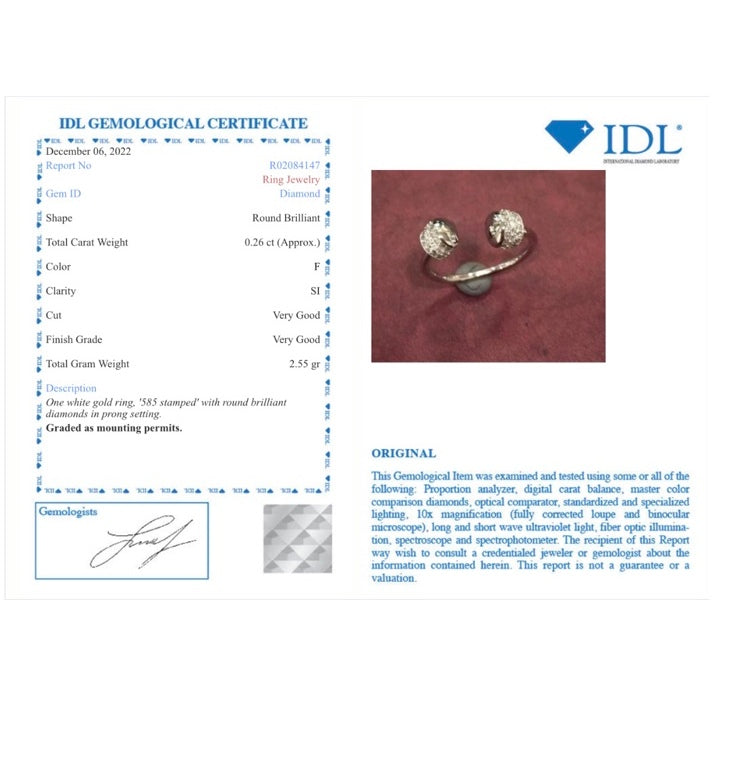 This jewel has a valid international certificate issued by the International Diamond Laboratory (IDL) .