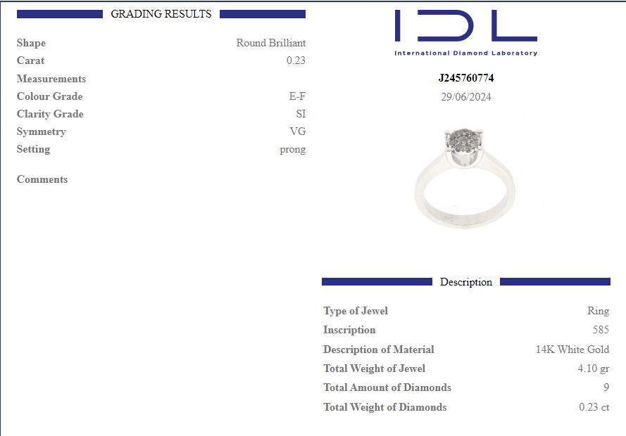 This jewel has a valid international certificate issued by the International Diamond Laboratory (IDL) .