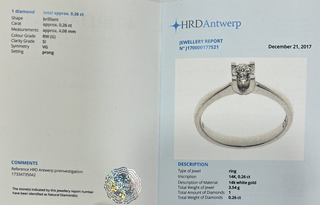 Годежен златен пръстен от бяло злато с диамант с големина 0.26 карата. Нежен годежен пръстен с красив бял диамант, поставен върху висококачествено 14 каратово бяло злато. Диамантът върху този пръстен за годеж е сертифициран от HRD Антверпен Белгия и пристига при Вас със сертфикат, който гарантира неговите качество и произход. Ние в магазин за годежни пръстени София Shemay Diamond държим бижутата, които предлагаме да бъдат в най-високо качество и всички наши диамантени пръстени са придружени със сертификат. Годежният пръстен, който представяме на вниманието Ви е с един диамант в класически стил. Съчетава се отлично с други бижута, като диамантени обеци или висулка с диамант, както и може да се носи заедно с брачна халка.