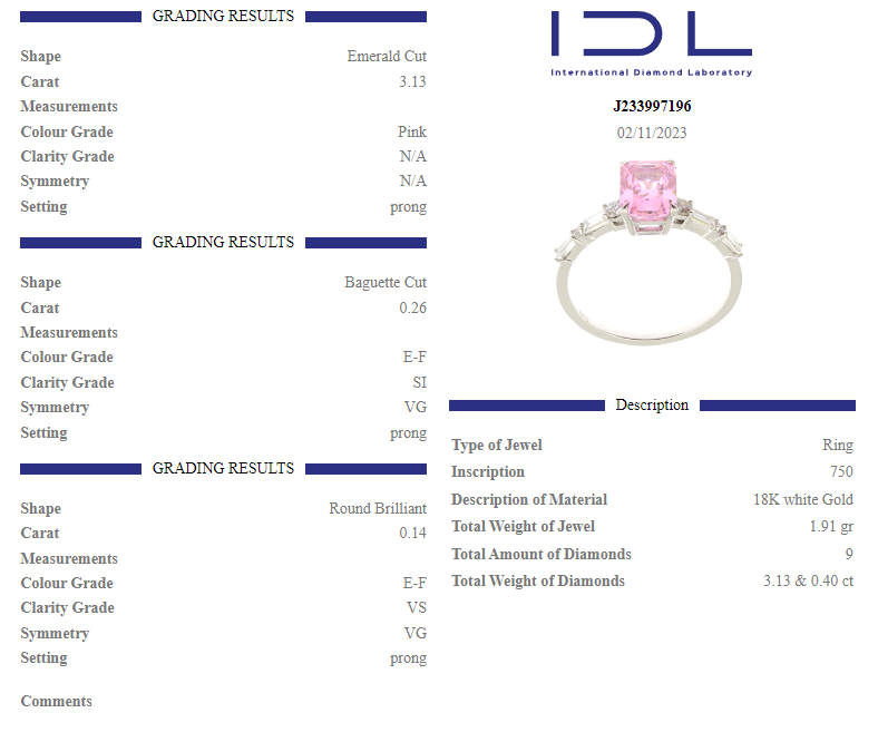 Това бижу притежава валиден международен сертификат, издаден от Iternational Diamond Laboratory (IDL) .
