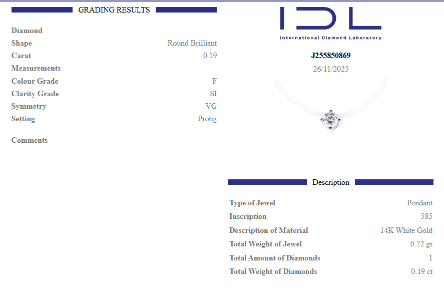 Това бижу притежава валиден международен сертификат, издаден от Iternational Diamond Laboratory (IDL).