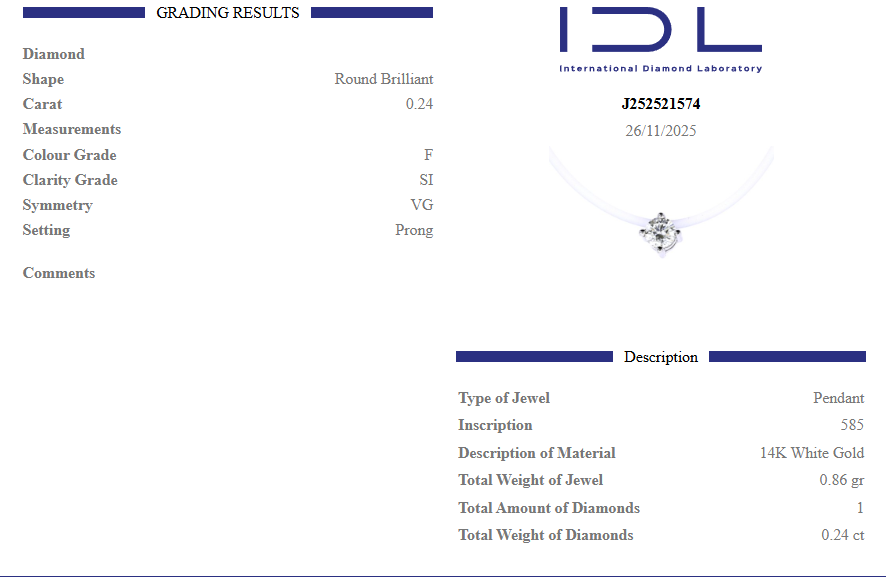 Това бижу притежава валиден международен сертификат, издаден от Iternational Diamond Laboratory (IDL).