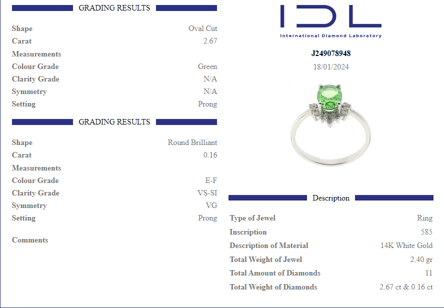 Това бижу притежава валиден международен сертификат, издаден от Iternational Diamond Laboratory (IDL) .