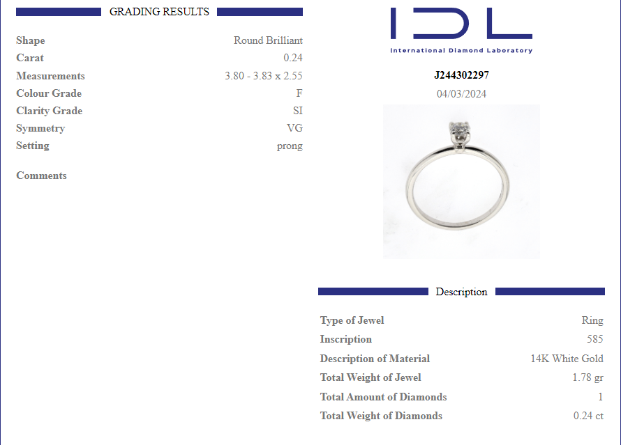 Това бижу притежава валиден международен сертификат, издаден от Iternational Diamond Laboratory (IDL) .