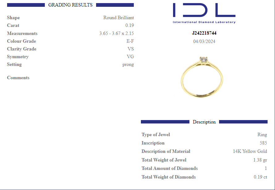 Това бижу притежава валиден международен сертификат, издаден от Iternational Diamond Laboratory (IDL) .