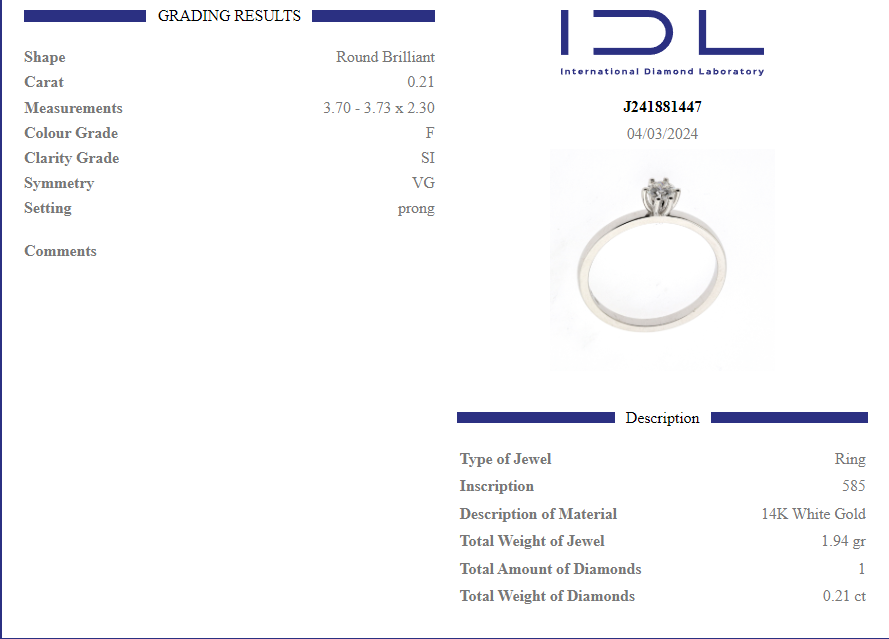 Това бижу притежава валиден международен сертификат, издаден от Iternational Diamond Laboratory (IDL) .