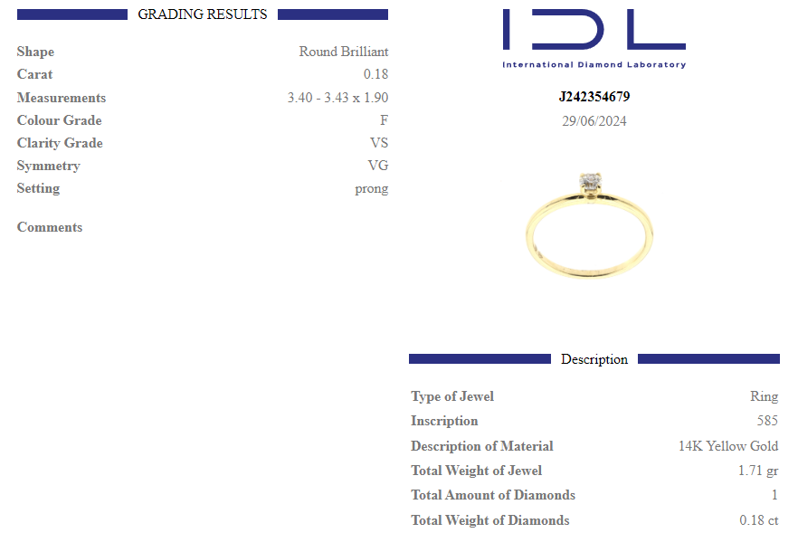 Това бижу притежава валиден международен сертификат, издаден от Iternational Diamond Laboratory (IDL) .