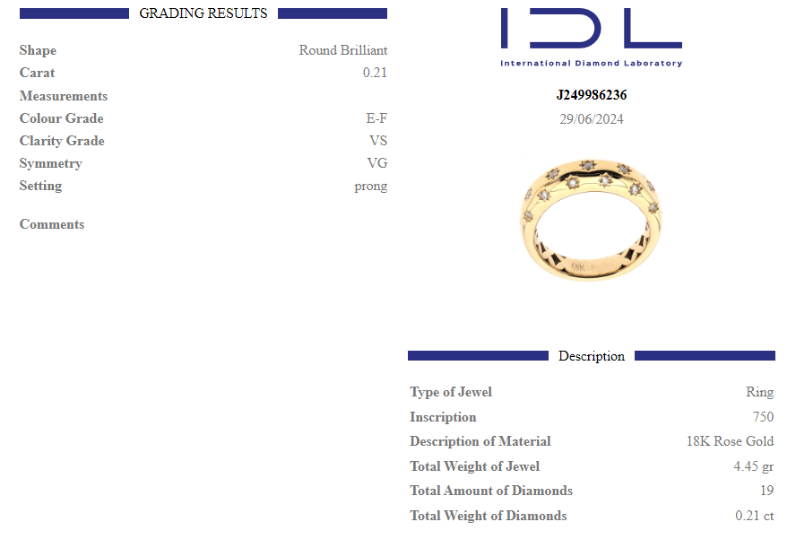 Това бижу притежава валиден международен сертификат, издаден от Iternational Diamond Laboratory (IDL) .