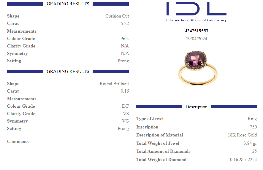 Това бижу притежава валиден международен сертификат, издаден от Iternational Diamond Laboratory (IDL) .