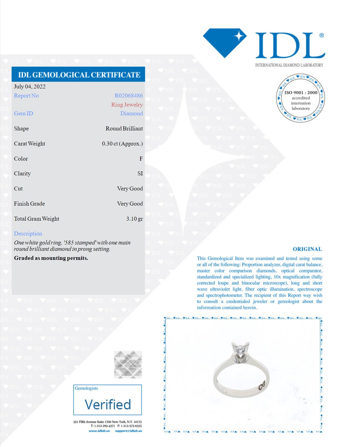 Това бижу притежава валиден международен сертификат, издаден от Iternational Diamond Laboratory (IDL) .